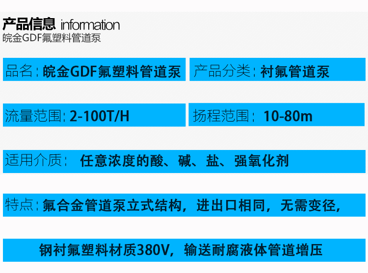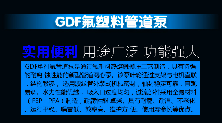 GDF氟塑料管道泵是耐腐蝕化工離心泵中的一種立式結(jié)構(gòu)形式的泵,安裝維護(hù)方便(維護(hù)葉輪、泵體、軸承時(shí)可以不拆除管道)、性能范圍廣、成熟等優(yōu)勢(shì)。耐腐蝕管道泵和耐酸堿管道泵,作為耐腐蝕泵中的氟塑料材質(zhì)泵在耐腐蝕性上的表現(xiàn),氟塑料管道泵以襯氟管道泵得到大多數(shù)工況企業(yè)的青睞。