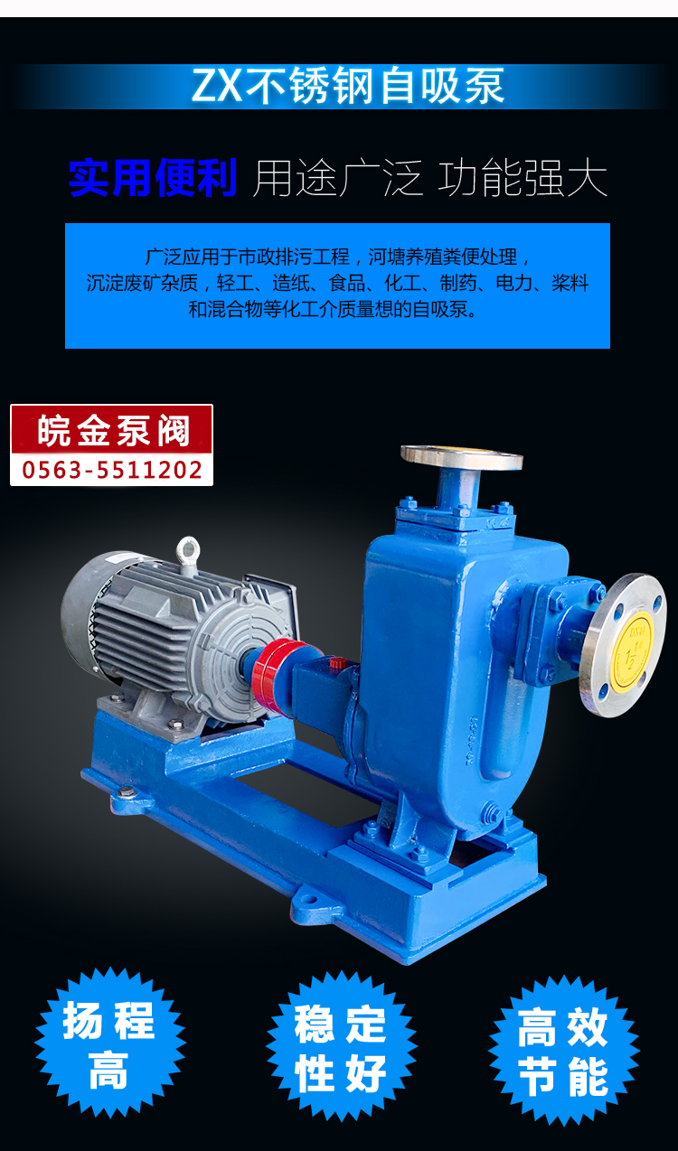 ZX自吸泵與國(guó)內(nèi)同類產(chǎn)品相比,具有結(jié)構(gòu)簡(jiǎn)單,自吸性能好,(自吸高度可達(dá)5m),排污能力強(qiáng),高效節(jié)能,維修方便(可替代WQ、QW潛污泵)等特點(diǎn), 廣泛應(yīng)用于市政排污工程,河塘養(yǎng)殖糞便處理,沉淀廢礦雜質(zhì),輕工、造紙、食品、化工、制藥、電力、槳料和混合物等化工介質(zhì)量想的自吸泵。